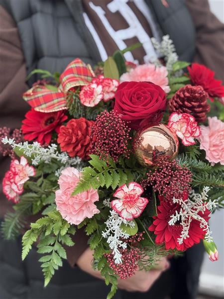 A beautiful Christmas hat box arrangement that is perfect for any seasonal table.
