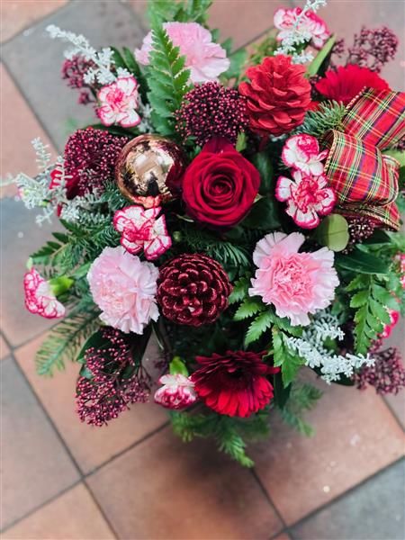 Pop the beautiful hat box in the centre of your Christmas Day table or send it as the perfect gift to a loved one. Set in oasis it is easy to care for and looks lovely for the whole festive season.