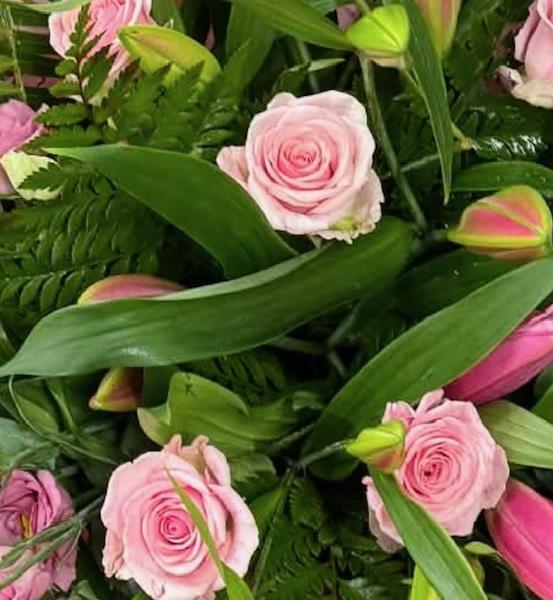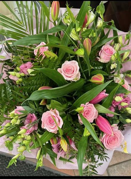 A bouquet brimming with beautiful pink oriental Lily’s and stunning large headed pink roses. With hints of lizianthus to compliment.