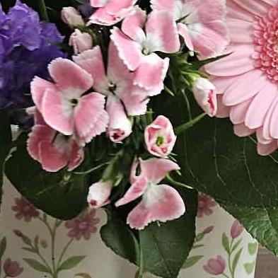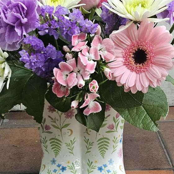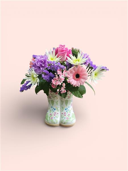 A beautiful arrangement of season blooms in shades of pink white and lilac arranged in a pair of petite ceramic boots. An ideal gift that can be kept year after year and re used.