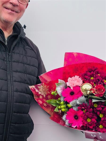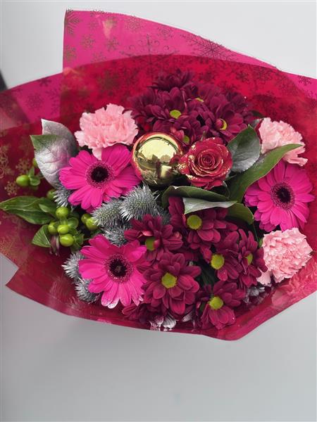 Introducing our petite hand tied bouquet that’s the perfect little gift. Santa’s gift box features beautiful red and pink blooms with hints of gold or silver and seasonal foliage all gift wrapped in a cute little gift box