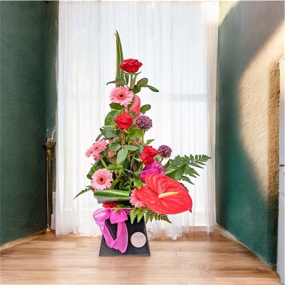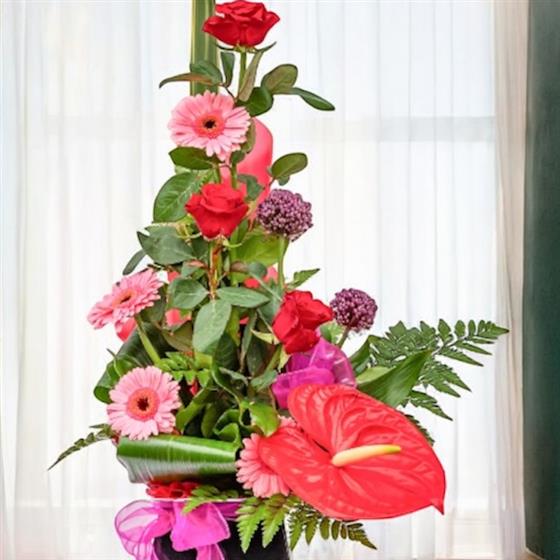 A beautiful floral arrangement in a co-ordinating container featuring roses germini anthurium seasonal foliage in bold bright tropical colours. (Flowers and colours may vary due to seasonal availability)