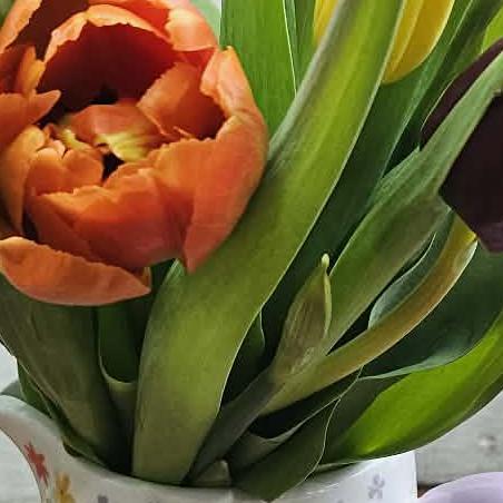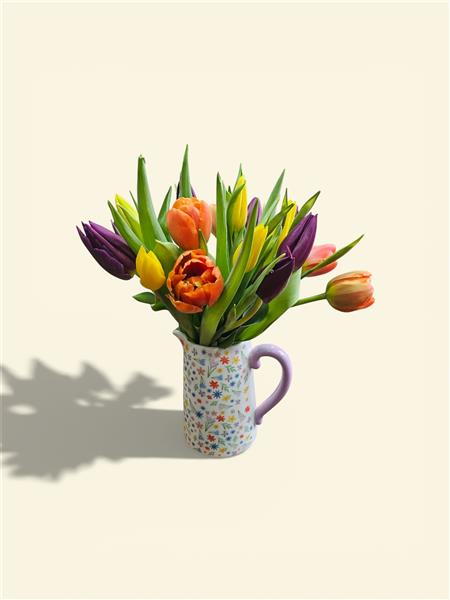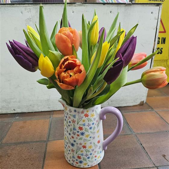A beautiful ceramic floral jug filled to the brim with beautiful mixed seasonal tulips. A favourite year after year for any occasion. But a classic for Mother’s Day.
