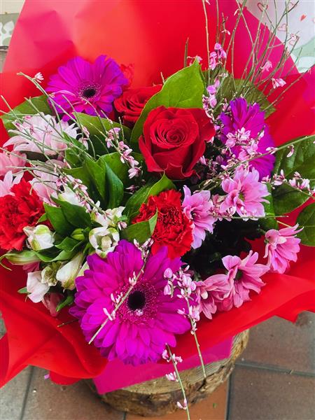 The bouquet of love chosen by Julie is a hand tied bouquet filled with a selection of pink and red blooms including roses, broom, alstromeria, and seasonal foliage. A perfect valentines gift and Julie's favourite of the whole collection