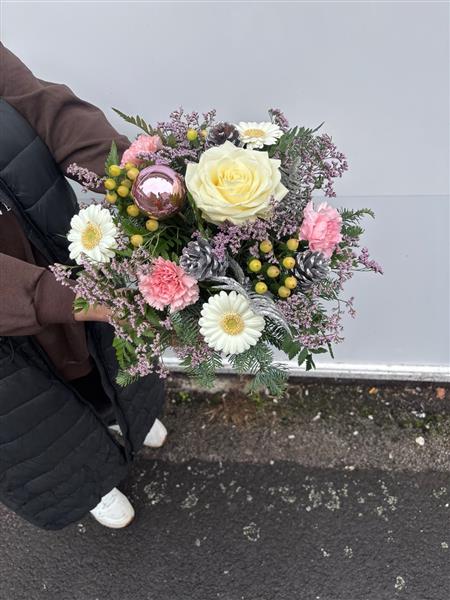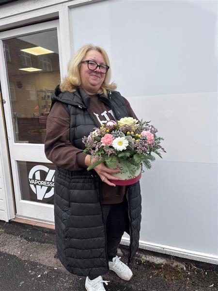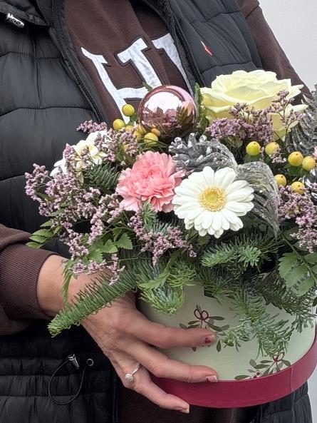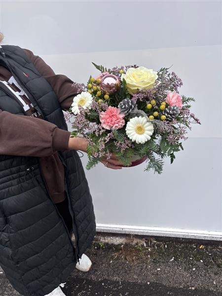 The perfect gift for any occasion but an ideal one for a winter birthday.  Featuring crisp winter whites pale pinks winter berries, foliages and hints of silver all arranged in a beautiful coordinated hat box. Simply perfect and so easy to care for.